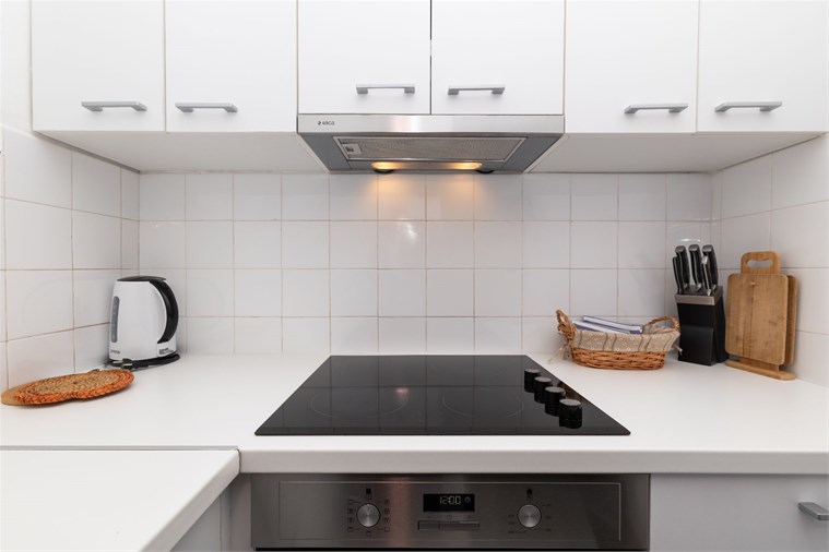 * Attrezzatura da cucina di base con utensili per preparare e servire cibi e bevande, posate per tutti gli ospiti, prodotti per la pulizia e la pulizia, frigorifero e piano cottura